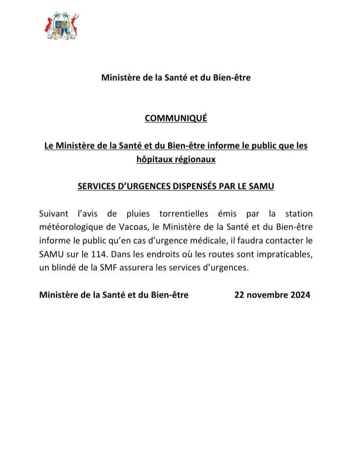 Nov 22, 2024 | Posted by UB | 0 Selon un communiqué du ministère de la Santé et du Bien-être, en cas d'urgence, le SAMU est joignable au 114. Si certains accès deviennent impraticables, la SMF prendra en charge les services d'urgence View the discussion thread.